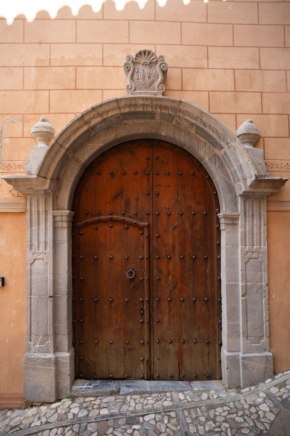 La porta principal de Cal Compte és una portalada adovellada d’arc de mig punt (un arc semicircular), una solució molt habitual en masies i cases pairals catalanes: l’arc reparteix el pes cap als laterals i, alhora, dona presència a la façana. Tant les dovelles (les peces de l’arc) com els brancals (els laterals verticals de la porta) són d’una pedra coneguda popularment com a “pedra blava”. Es tracta d’una calcària sedimentària que, segons les vetes pot agafar tonalitats grises o blavoses, d’aquí el nom.